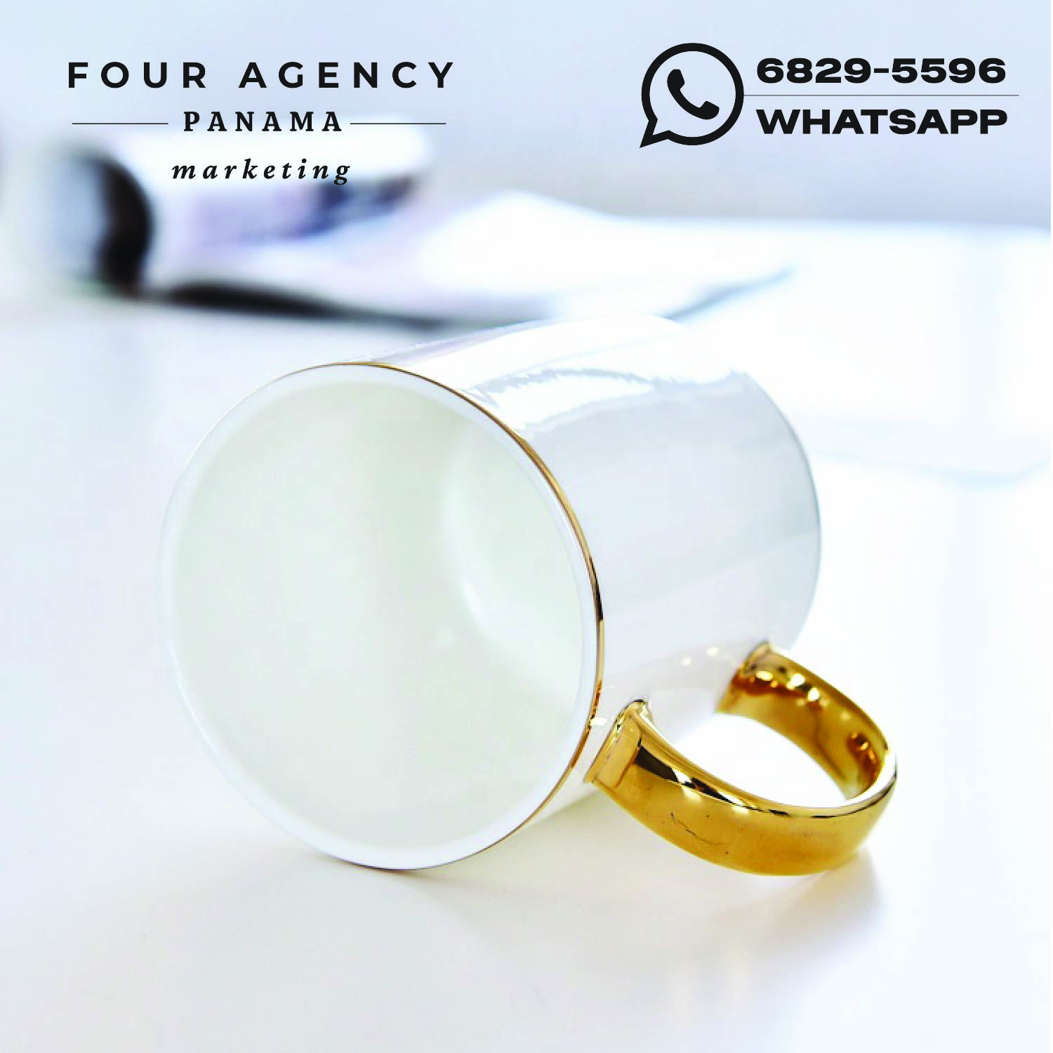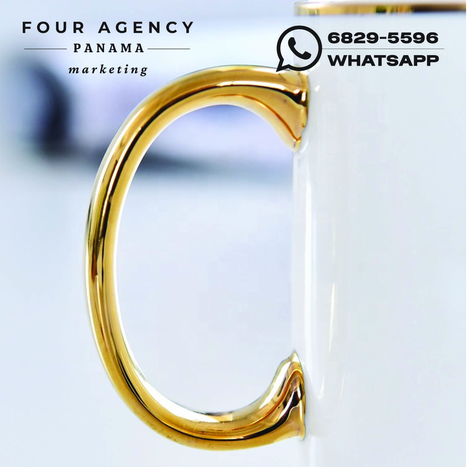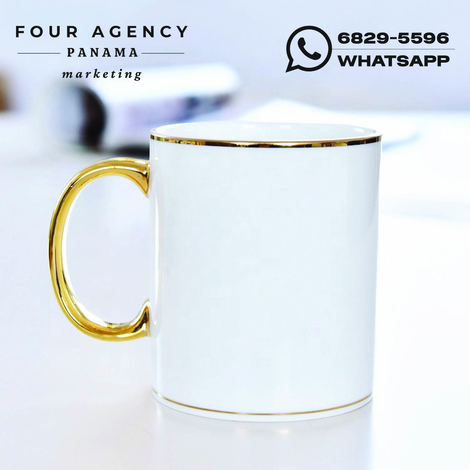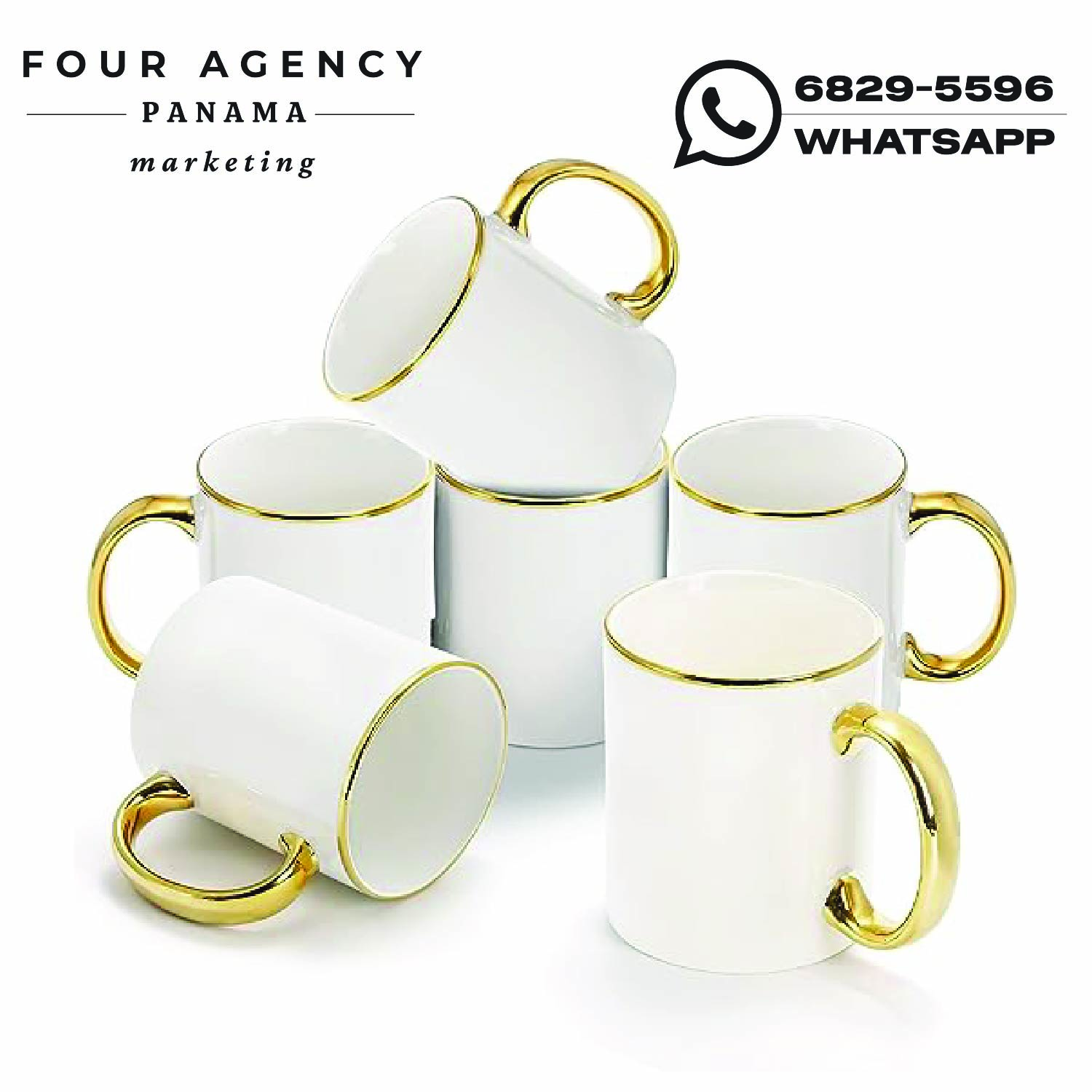 Fabricada en porcelana de alta calidad, esta taza está diseñada para impresión personalizada, permitiendo plasmar logotipos, frases corporativas, diseños especiales o ilustraciones creativas con excelente definición y durabilidad. Su fondo blanco ofrece una base limpia y versátil que resalta los colores del diseño, mientras que los detalles dorados aportan un toque distintivo que transmite elegancia y exclusividad.